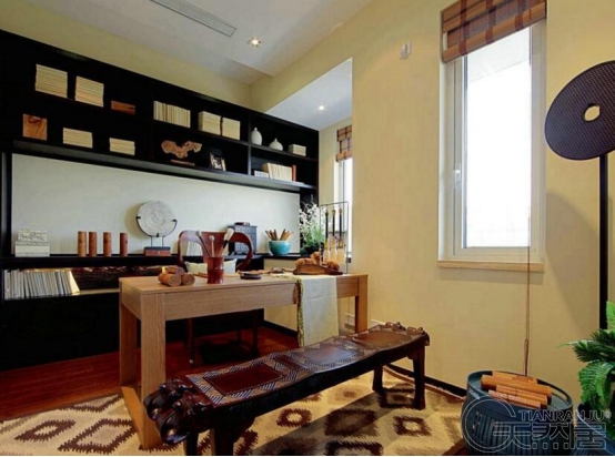 現(xiàn)代硅藻泥書(shū)房裝修,清新典雅,給人以生機(jī)盎然的感覺(jué),這是東南亞書(shū)房給人的第一印象。帶有編織花紋的小家具襯以堪比壁紙花圖案的硅藻泥背景墻墻壁,充溢異國(guó)情調(diào)。