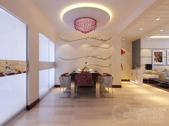 桌椅、餐具等已經(jīng)讓就餐氛圍熱鬧起來,墻面便可盡量簡潔有趣,與環(huán)境融合尤為重要,色彩圖案不同的餐廳能給人帶來不同的感官刺激,照顧你的味蕾。餐廳是與客廳緊密相連的次空間,對于花色的選擇需要謹(jǐn)慎,紅色使人興奮,綠色保持食欲,鵝黃韻味悠長…… 獨立餐廳可以四壁滿鋪,就餐區(qū)可以單面墻整鋪或局部鋪貼。用色活潑能激發(fā)食欲,純色墻面顯得干凈質(zhì)樸,雅致圖案則更凸顯家人團聚的溫馨。